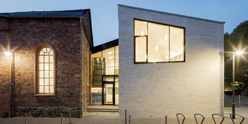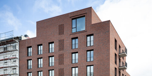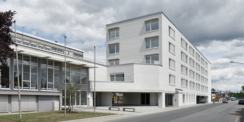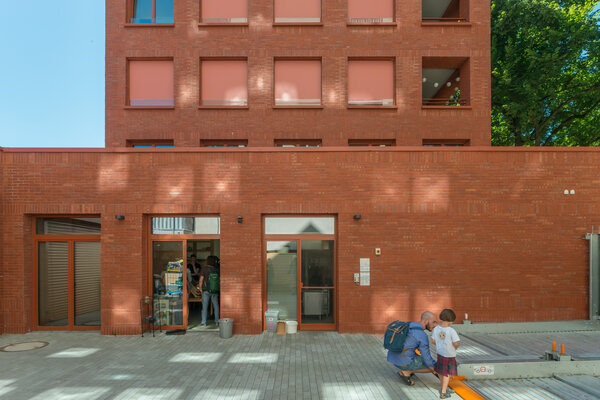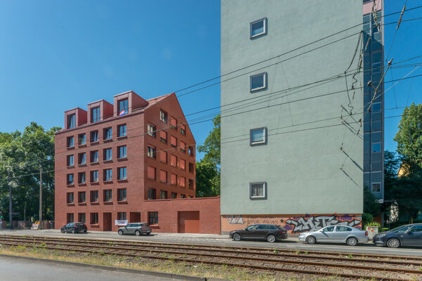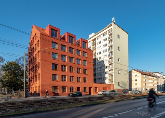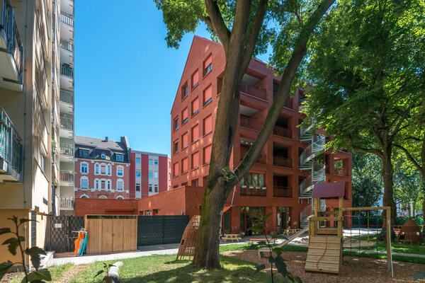Der fünfgeschossige Neubau mit 13 Wohnungen und einer Kita ersetzt einen niedrigen Flachbau aus den 1970er Jahren. Das Haus reagiert auf die städtebauliche Situation zwischen der Schloßstraße und dem Von-Bernus-Park. Auf der Straßenseite nimmt es die Bebauungs- und Dachkante der anderen Häuser auf und fügt sich mit seinem Satteldach selbstverständlich ein. Zum Park hin öffnet es sich mit großen Loggien und Fenstern. Die markante, ein-farbig rote Klinkerfassade wirkt vertraut und wohnlich.