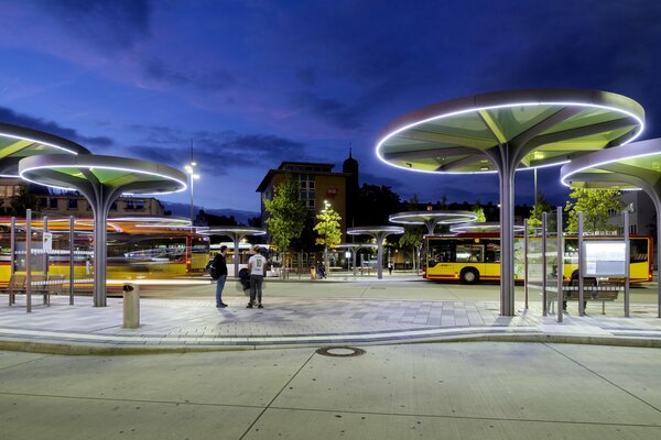 Atmosphärisch bestimmt wird der Freiheitsplatz durch das historische Motiv der baumbestandenen Esplanade. Die Überdachung der Bussteige sind als einzelne Module konzipiert, deren Entwurfsansatz die grafische Schön-heit von Baumstrukturen abstrahiert. Mit den über 40 neu gepflanzten Bäumen bilden sie ein großes, grünes Dach. Bei Sonnenlicht entsteht durch deren grün-gelbe Glasdächer eine entsprechende Lichtfärbung auf den Bussteigen, die durch das Schattenbild des Tragwerks reizvoll ergänzt wird.