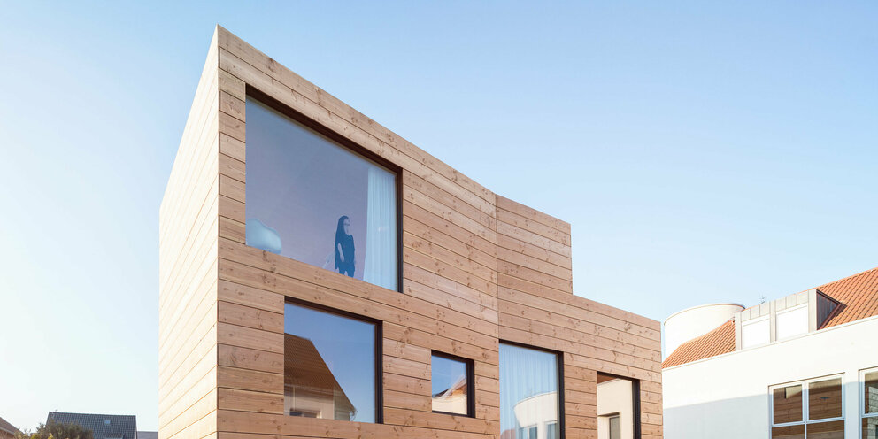 Das kleine Bürohaus ist in einer Holztafelbauweise errichtet worden. Das Material Holz findet nicht nur in der Konstruktion seine Anwendung, sondern wird sowohl als Dämmung als auch wegen seiner haptischen und optischen Qualität eingesetzt. Es entspricht einer ganzheitlichen Gestaltung – vom nachhaltigen Bauen mit dem Rohstoff Holz bis zur Aufwertung der lokalen Baukultur.