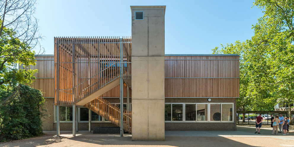 Durch die Aufstockung eines bestehenden Schulgebäudes aus den Sechzigerjahren konnte dem dringend notwendigen Schulraumbedarf wegen hoher Schülerzahlen Abhilfe geschafft werden. Die leichte Holzkonstruktion für die Aufstockung erwies sich auf verschiedenen Ebenen, von der Zeit- und Kosteneinsparung bis zum ressourcenschonenen Umgang von Bestand und Neubau, als nachhaltig.