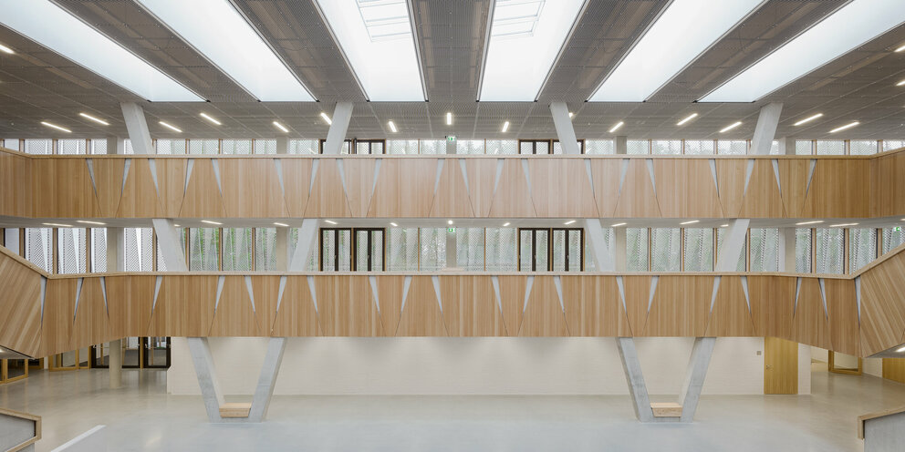 Der Neubau versteht sich als Lernhaus und grenzt sich von der traditionellen Flurschule ab. Er unterscheidet sich im Wesentlichen darin, indem er einen ganzheitlichen Ansatz von pädagogischen, räumlichen und organisatorischen Strukturen in Einklang miteinander zu verbinden sucht. Als „dritter Pädagoge“ unterstützt die Architektur das pädagogische Leitmotiv einer individuellen Förderung, das eigenverantwortliche Lernen sowie die Teambildung und macht es in der Differenzierung der Baukörper ablesbar.