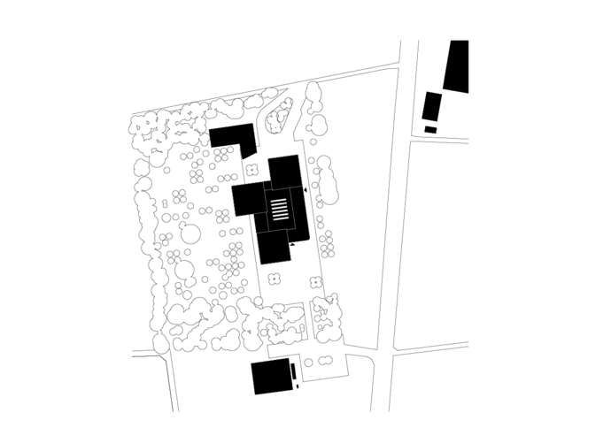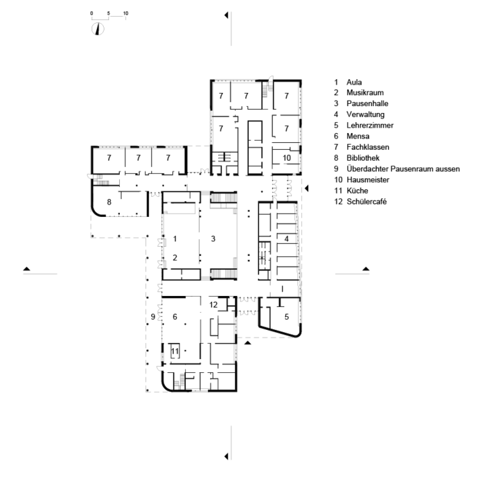 Von einem zentralen Verbindungsbau, welcher die öffentlichen und gemeinschaftlichen Funktionen, wie Aula, Musikraum sowie Pausenhalle aufnimmt, erschließt man drei angegliederte Baukörper, die in den Obergeschossen separate Einheiten an Klassenzimmern für die einzelnen Jahrgangsbereiche mit „gemeinsamer Mitte“ ausbilden – gewissermaßen eine kleine Schule in der Schule. Zentrales Element der „gemeinsamen Mitte“ ist das Lesepodest, welches den flexibel nutzbaren Gemeinschaftsbereich vor den Klassenzimmern in eine offene oder leicht abgeschirmte Raumsequenz als Rückzugsort unterteilt.