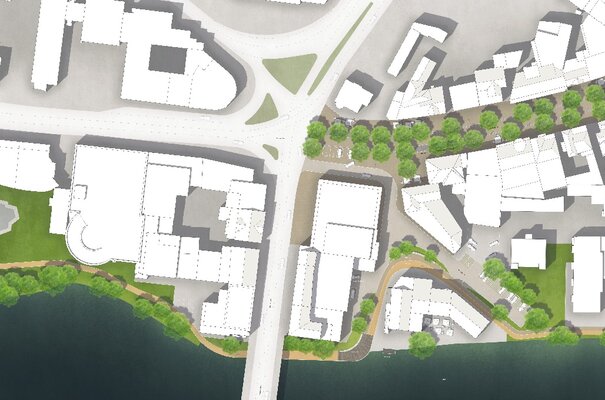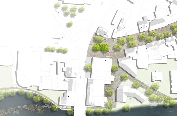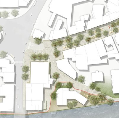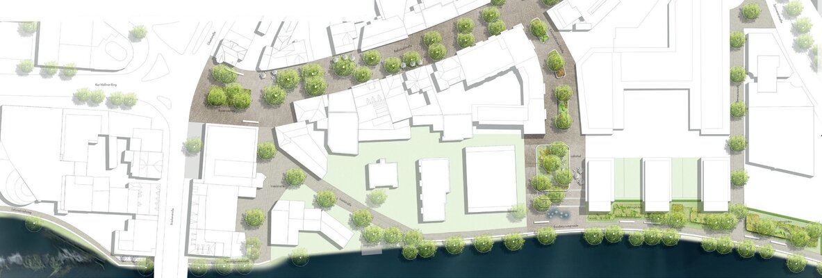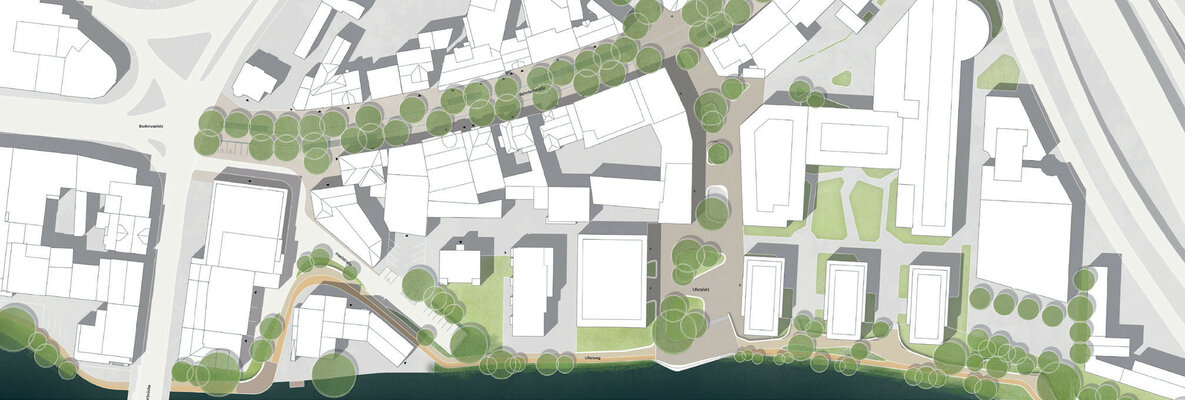Die lockere Allee der Bahnhofstraße wird unaufgeregt und im klassischen System eines stark linearen Raums in eine Aufenthaltszone an den Rändern und einen Bewegungsraum in der Mitte strukturiert, sodass viel Raum für Nutzung zur Verfügung steht. Das Grün bleibt mit den Baumkronen in der dritten Dimension und gibt der kühlen Urbanität eine wohnliche Atmosphäre.