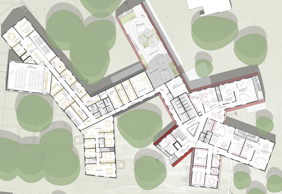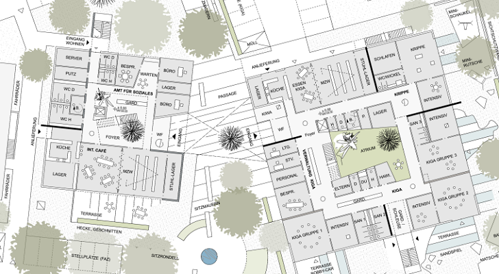 Das Familienzentrum und die Kita sind zweigeschossig organisiert. Die Kindertagespflege ist in einem eingeschossigen Baukörper der eigenständig nutzbar ist untergebracht und dennoch der direkt mit der Kita verbunden ist. Durch die Aufteilung der Volumen fügt sich der Vorschlag gut in die Umgebung ein.