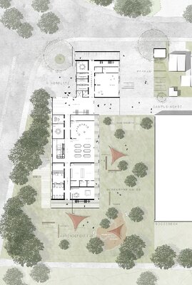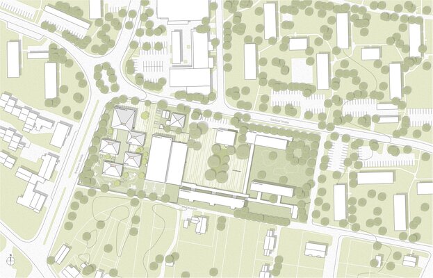 Der Entwurf stellt eine qualitätsvolle Verwebung der öffentlichen Wegebeziehungen in Kombination mit neuen Platzsituationen dar und ergänzt so den Schulcampus auf sehr selbstverständliche und überzeugende Weise.
