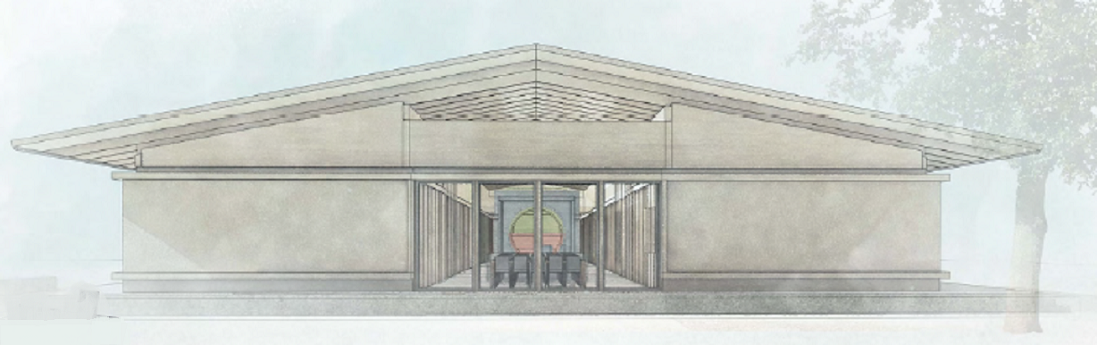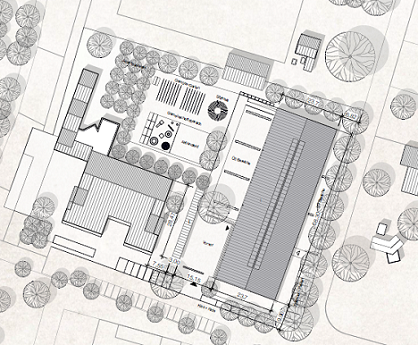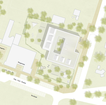 Die Verfasser formulieren einen kompakten eingeschossigen Baukörper, der sich als weiterer Baustein in der Abfolge vorhandener Solitärbauten am östlichen Ortsrand zwischen Bürgerhaus und Schule positioniert. Diese städtebauliche Setzung im nordöstlichen Bereich des Baugrundstücks wird als vorteilhaft bewertet. Insgesamt zeichnet sich der Entwurf durch seine übersichtliche Gestaltung und eine hohe Wirtschaftlichkeit aus.