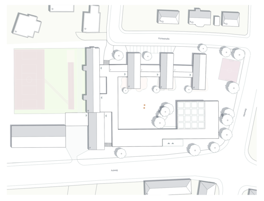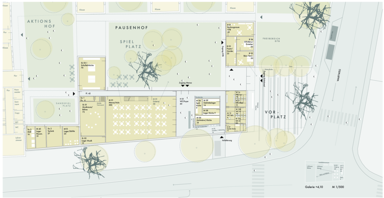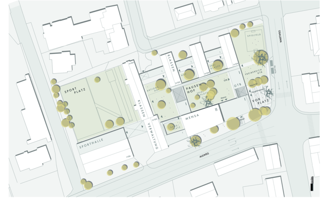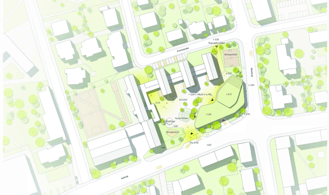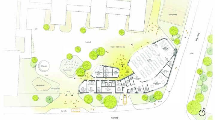 Der Entwurfsverfasser schlägt für den Neubau der Mensa der Ludwig-Uhland-Schule einen amorph entwickelten Baukörper vor, der sich geschickt auf dem bestehenden Schulgelände positioniert und den Schulhof öffnet, insbesondere durch die Ausrichtung der Gebäudekanten an den bestehenden Säuleneichen entsteht eine fein differenzierte Gliederung und Differenzierung des Schulgeländes ohne größere Restflächen entstehen zu lassen.