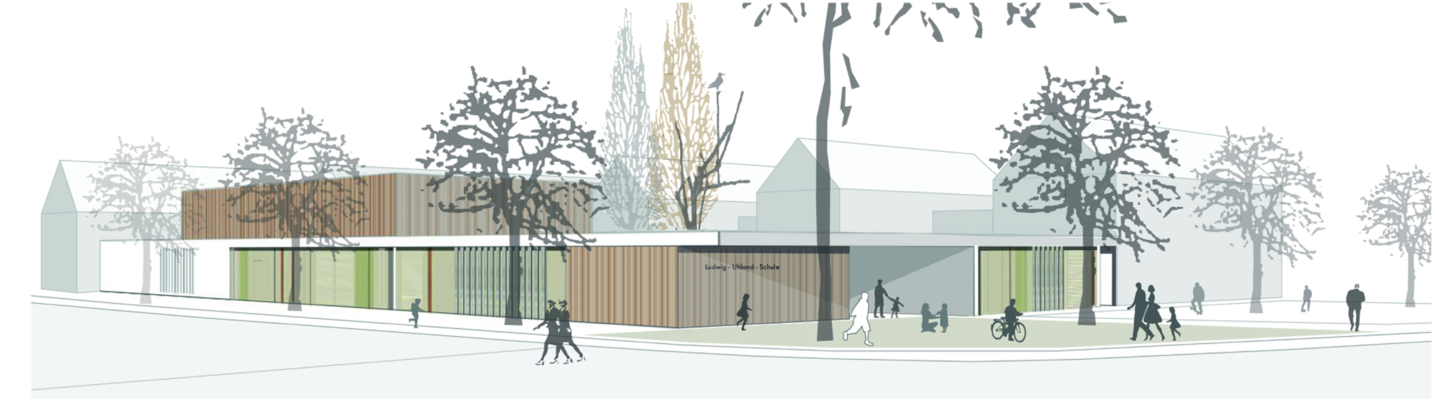 Aufgrund der prognostizierten Schülerzahl, dem wachsenden Bedarf eines ausgeweiteten Ganztagesangebots und gewachsenen, pädagogischen Anforderungen mit verbesserten Raumangeboten wird der Gesamtflächenbedarf steigen. Die Ludwig-Uhland-Schule soll mit der Planung einer Mensa/Aula in einer ersten Erweiterungsstufe ergänzt werden. Dabei soll die Schule auch einen neuen zentralen Zugangsbereich erhalten. Anlass hierfür ist die Förderung des Projektes aus Mitteln des Kommunalinvestitionsprogrammes des Bundes.