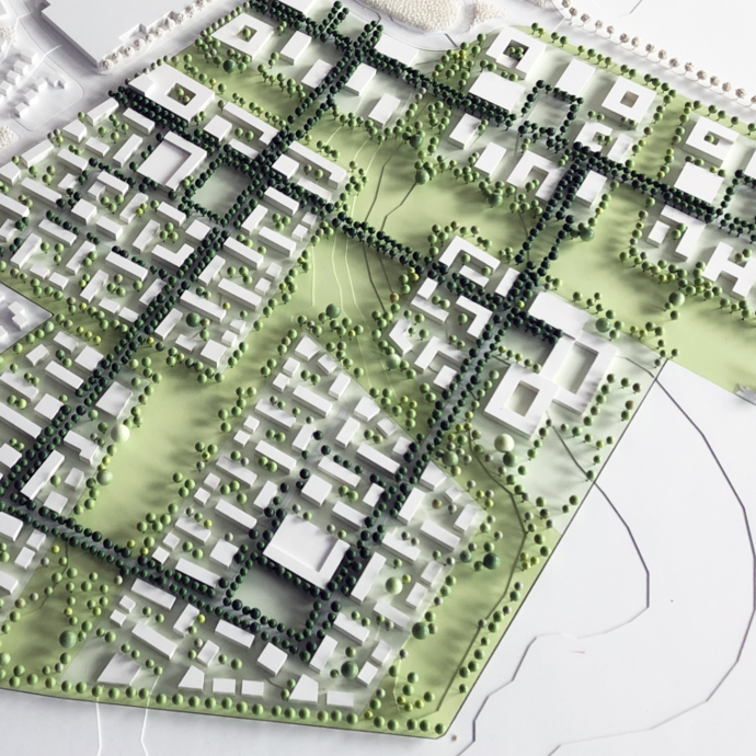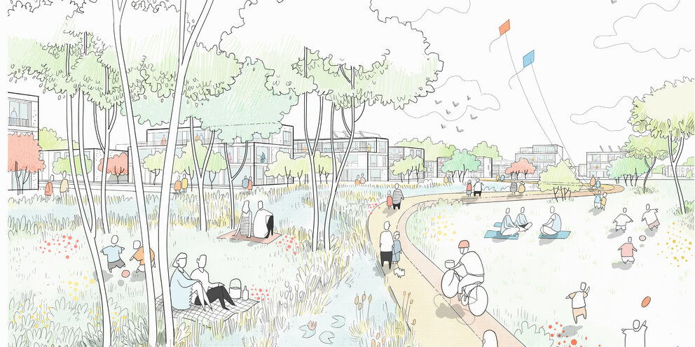 Das städtebauliche Leitbild basiert auf der Grundidee, aus der ehemaligen Flusslandschaft eine Parklandschaft zu entwickeln. Mit dieser Form der historischen Spurensuche entsteht ein überzeugendes räumliches Rückgrat für den neuen Stadtteil, das sowohl eine wichtige ökologische Funktion als auch eine identitätsstiftende Wirkung übernimmt.
