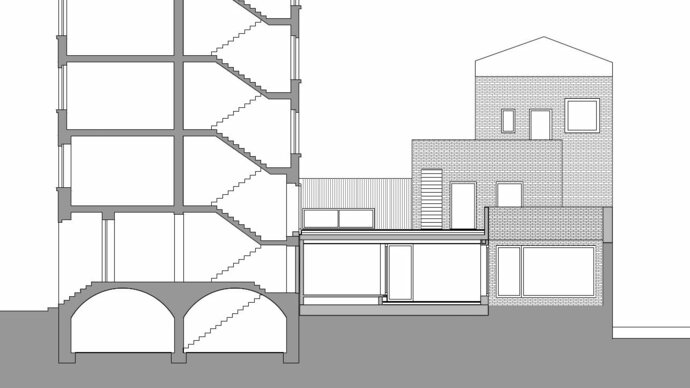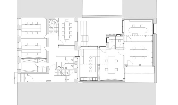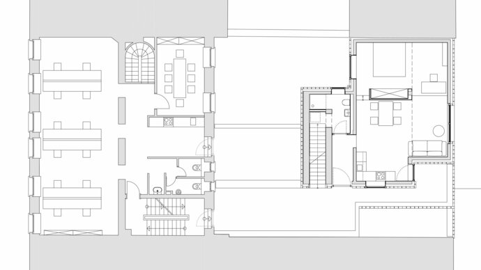 Das Frankfurter Architekturbüro nkbak hat eine spannende Raumfigur aus dem Kontext heraus mit seinen Versatzstücken entwickelt, die in den Bestand nahezu übergeht, ohne an Eigenständigkeit zu verlieren.