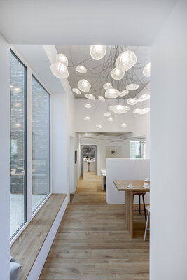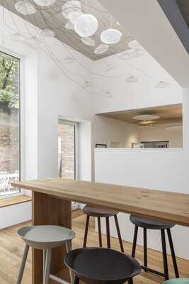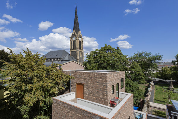 Trotz einer sehr komplexen Ausgangssituation mit denkmalgeschützter Friedhofsmauer und einem schwer zugänglichen Grundstück ist ein wunderschöner Bau entstanden. Trotz einer Verdichtung sind unterschiedliche Außenflächen erhalten geblieben, die die Lebens- und Arbeitsqualität signifikant steigern.