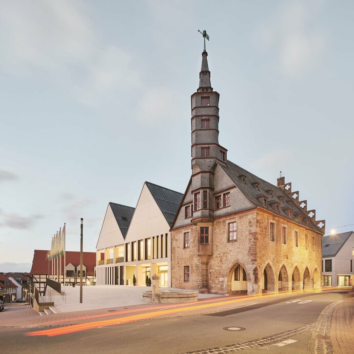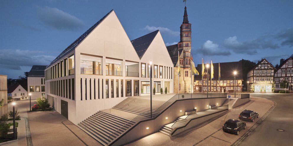 Das neue Rathaus von Korbach, der Kreis- und Hansestadt des Landkreises Waldeck-Frankenberg, westlich von Kassel, thront auf dem höchst gelegenen Standort des mittelalterlichen Stadtzentrums. Es ist ein prägendes Gebäude: modern, hochwertig, reduziert in der Materialwahl und zugleich repräsentativ. Sowohl aus baukultureller Sicht als auch als Instrument der Stadtreparatur ist das Projekt äußerst gelungen. Durch sein Aufgreifen des Maßstabs und der Giebelstrukturen fügt sich das Rathaus angemessen in das Stadtbild und den städtebaulichen Kontext der Altstadt ein. Das Gebäude nimmt historische Bezüge auf, ohne im engeren Sinn historisierend zu sein.