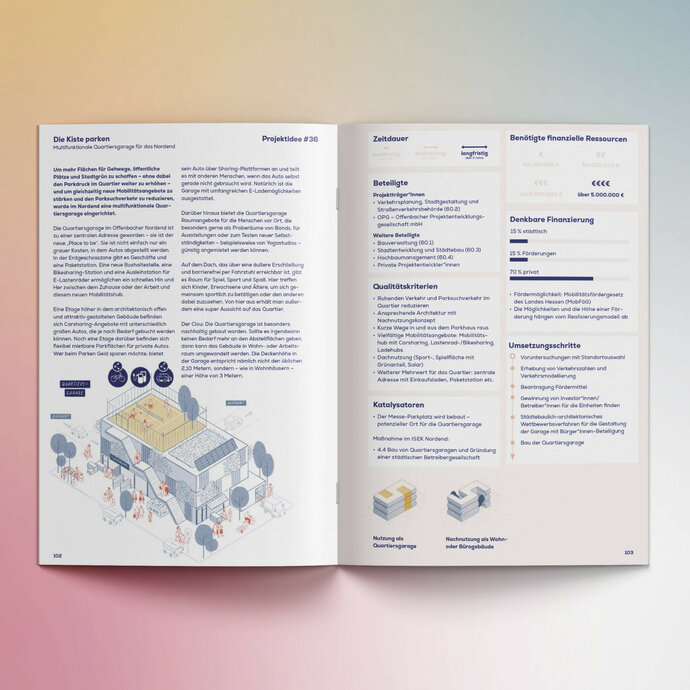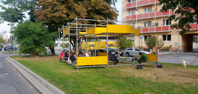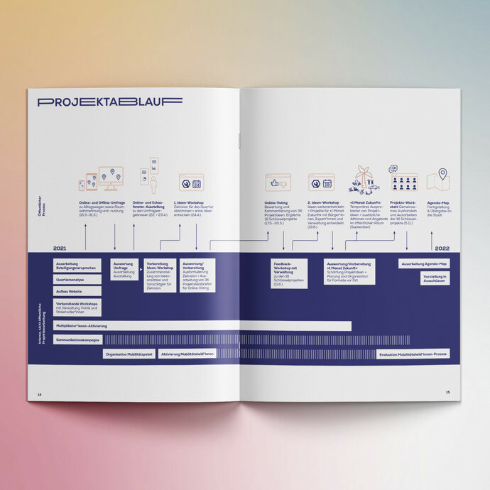 Der Prozess fand zwischen 2019 und 2022 in mehreren Phasen statt. In einer ersten Phase wurden mithilfe von Workshops und Online-Umfragen neuralgische Punkte im Quartier ermittelt. Aus dieser ersten Runde wurden insgesamt 30 Projektideen entwickelt, von denen fünf als niederschwellige, einfache temporäre Rauminterventionen für jeweils einen Monat umgesetzt werden konnten. Am Ende des Zeitraums wurden der Prozess und die gesammelten Ergebnisse in einer abschließenden Broschüre zusammengefasst. Von Seiten der Stadt Offenbach ist eine weiterführende Bearbeitung der temporär bespielten Orte zugesagt und es sollen konkrete Projekte entstehen. Parallel führt das infolge des Projekts entstandene Bewusstsein zu regelmäßigen von den Bewohner*innen organisierten Aktionen im Straßenraum, die von einem aktiven und engagierten Quartiersmanagement unterstützt werden.