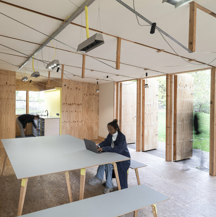 Was die Ausführung angeht, so fällt auf, dass aus dem Transformationsprozess Anpassungen erfolgt sind, wie die Küchennische mit separatem Zugang oder wie das Sonnendach für outdoor-Veranstaltungen, die schlüssig und durchdacht erscheinen. Man könnte sagen, dass dieser Prozess zu einer besonderen Gestaltungsqualität geführt hat. Bemerkenswert ist auch die innenräumliche Qualität, die eine solide, angenehme und überhaupt nicht barackenartige Empfindung generiert. Die Räume sind funktional, einfach zusammenzuschalten und auch einzeln nutzbar. Insgesamt ein durchdachtes Konzept, was einen hohen Grad an Verbindung mit dem Außenraum ermöglicht.