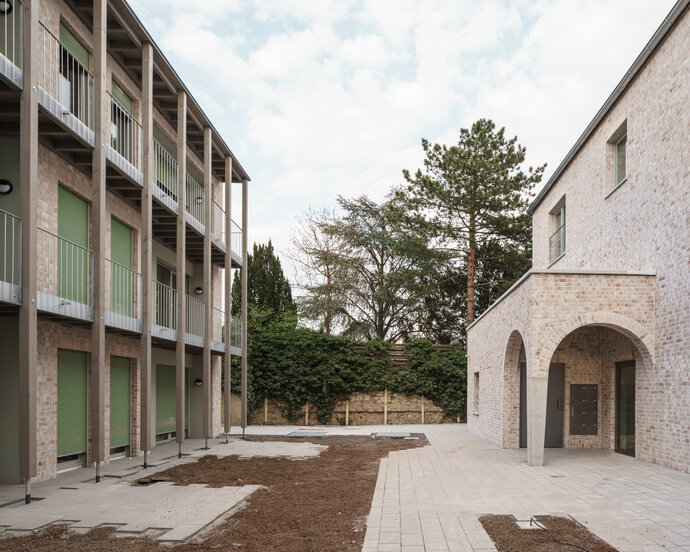 Die kleinteilige Bebauung aus sieben Häusern wurde sorgfältig in den Stadtraum eingepasst und bildet eine attraktive Hofsequenz. Die Materialisierung und Gestalt der Klinkerhäuser orientiert sich an den umgebenden Wohn- und Industriebauten der nahen Opel-Werke sowie an der ortstypischen Bebauungsform der Hofreiten. Es gelingt den Architekt*innen über das Aufgreifen historischer Motive, die Neubauten auf eine sehr selbstverständliche Weise in das Quartier einzufügen. Diese bieten einen attraktiven Wohnungsmix aus Kleinwohnungen für Einzelpersonen und Studierende, barrierefreien Wohnungen, Familienwohnungen sowie Wohnungen für Wohngemeinschaften, wodurch die soziale Durchmischung im Quartier gefördert wird.