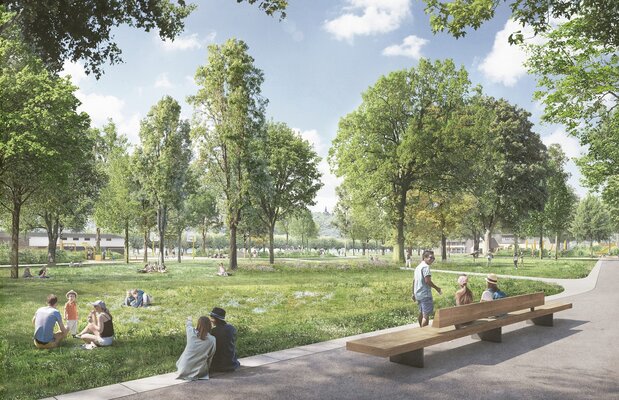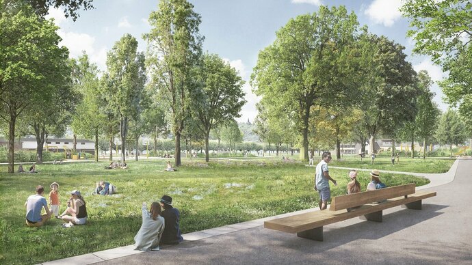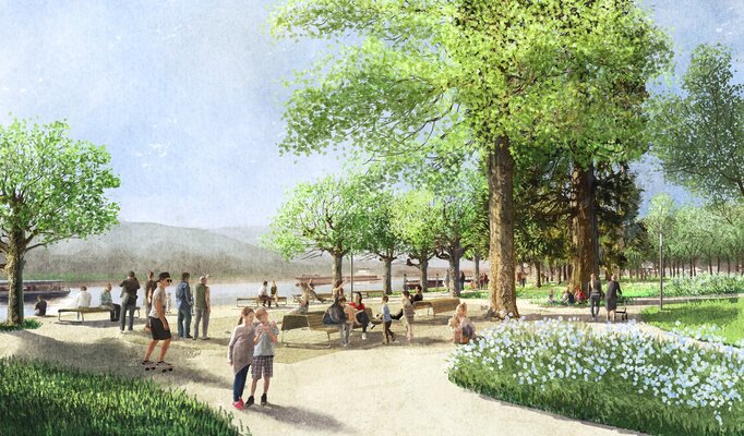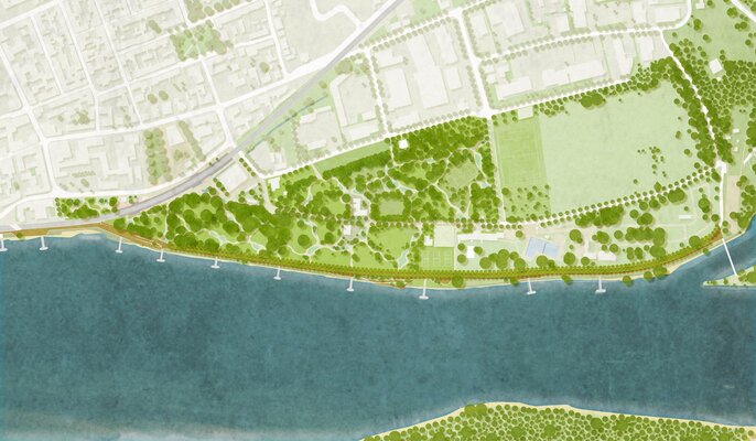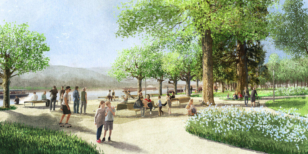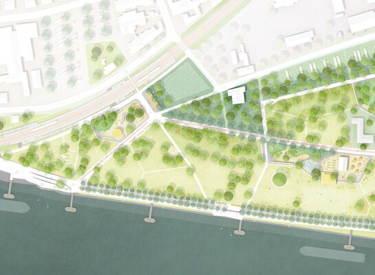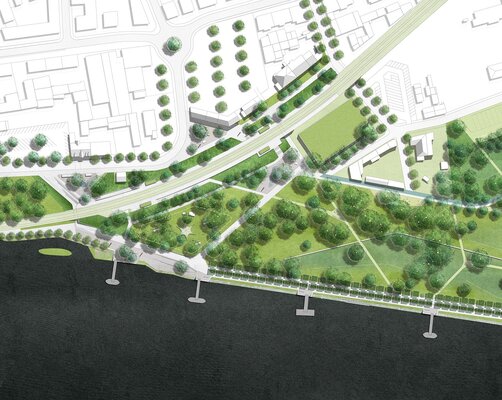 Neben der Neugestaltung der Uferpromenade mit den zahlreichen Anlegestellen der Flusskreuzfahrtschiffe soll der Hafenpark um die bestehenden Sport- und Freizeitnutzungen zu einem zusammenhängenden Freiraum entwickelt werden. Die Inszenierung und das Erlebbarmachen des bestehenden Parkbereiches mit der Umgestaltung der Kastanienallee ist dabei ebenso Wettbewerbsaufgabe wie die Anbindung der Fläche an den geplanten Mobilitätshub nördlich der Bahn und die geplanten Parkplätze/ggf. Parkhaus südlich der Bahn.