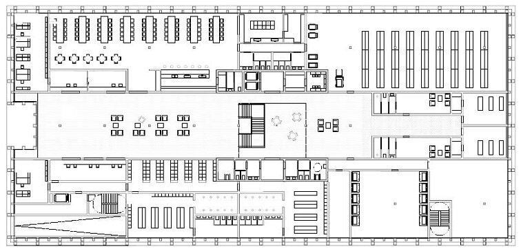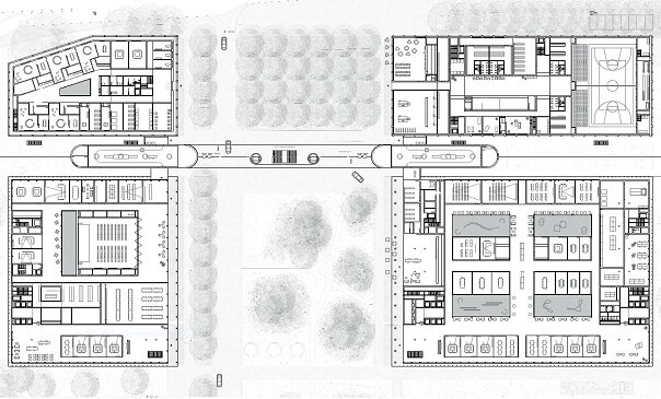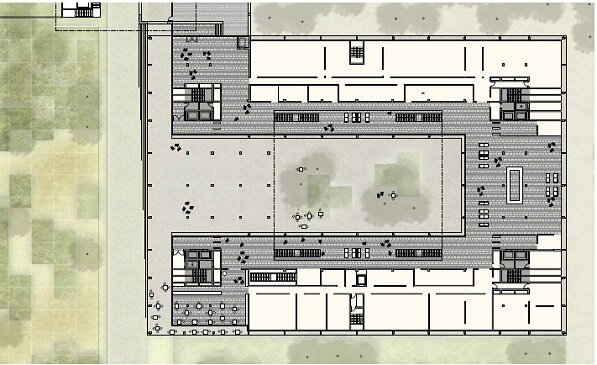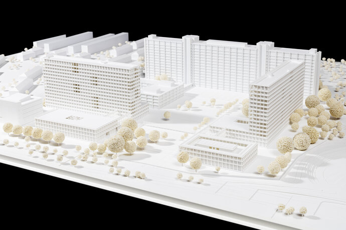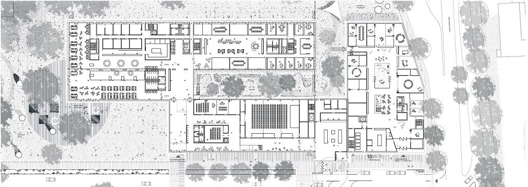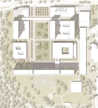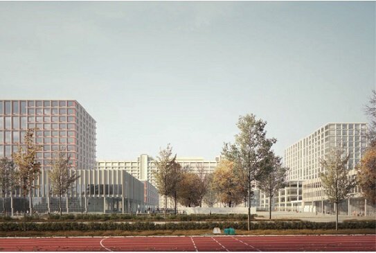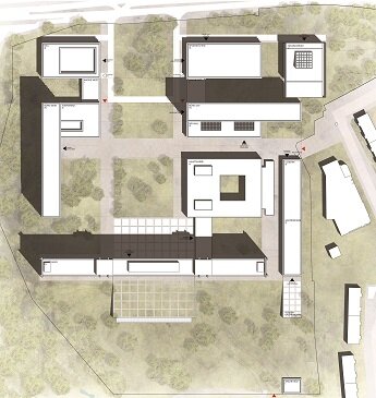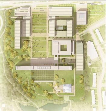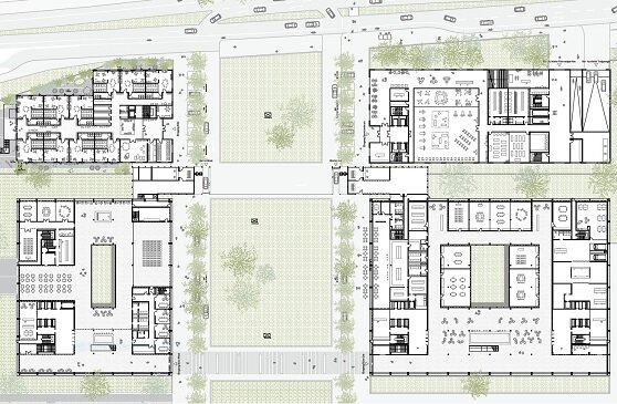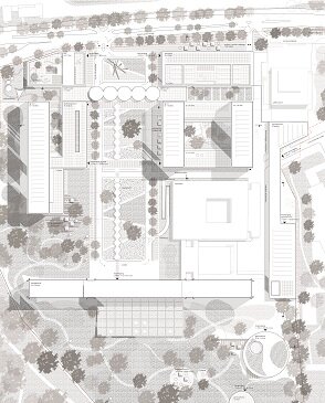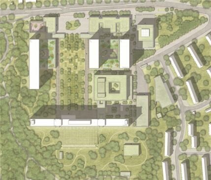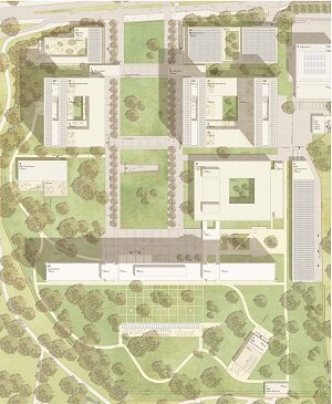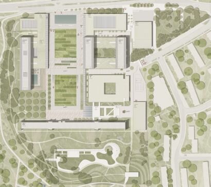 Durch die lineare Anordnung der Baukörper, die gewählten Dimensionen und die wiederkehrenden Innenhöfe ergibt sich ein harmonischer Campus-Charakter. Durch den Kontrast der filigranen plastischen Fassadengestaltung mit Metall bei den Neubauten und dem schweren Beton der Bestandsgebäude entsteht ein interessantes Spannungsverhältnis zwischen Tradition und Zukunft.