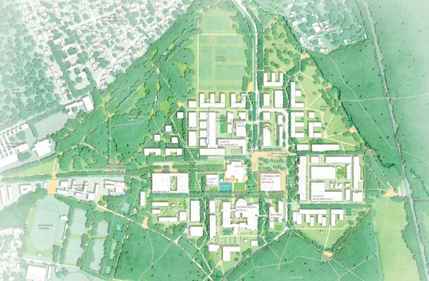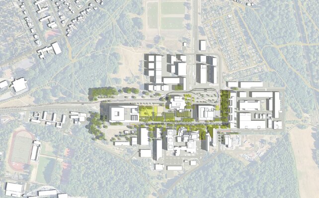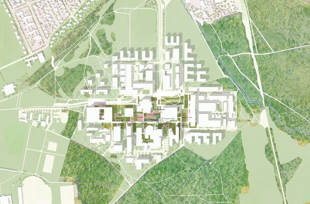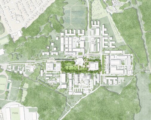 Hochschulstandorts, der sich mit den bereits geschaffenen Qualitäten verbindet und als qualitätsvolles Gesamtkonzept umsetzen lässt. Dabei soll die Vernetzung der Campusmitte mit den Binnen- und Freiräumen innerhalb der umgebenden Institutscluster sowie mit den umgebenden Landschaftsräumen mit betrachtet werden.