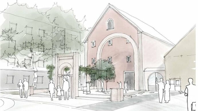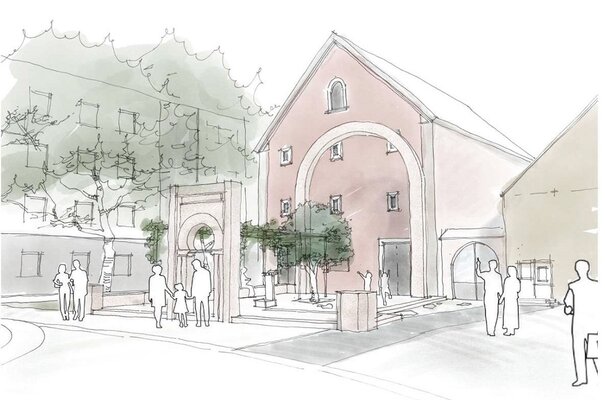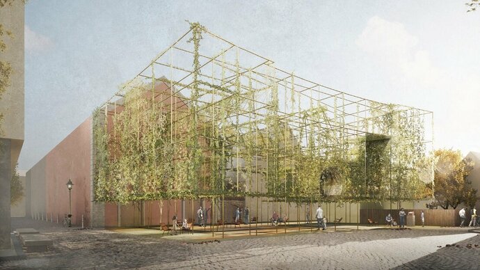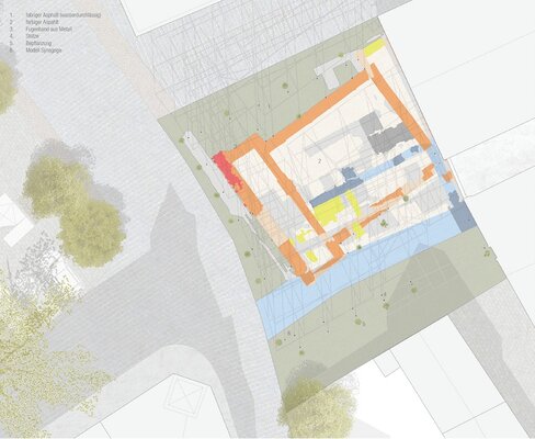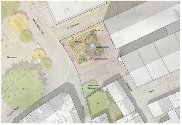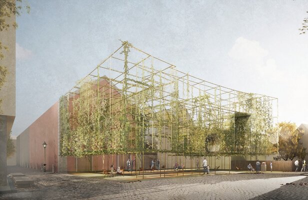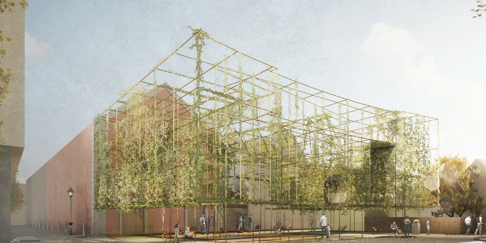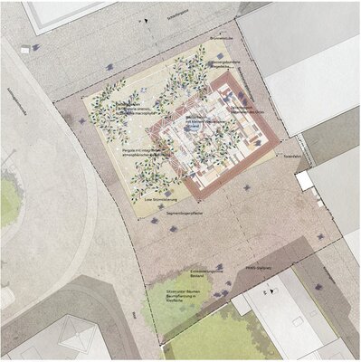 Die Verfasser schließen die Leerstelle der verlorenen Synagoge und schaffen eine überraschende neue stadt- und freiräumliche Qualität: Ein Stahlskelett füllt oberhalb der Fußgängerebene den Luftraum über dem Platz und verwandelt sich als Rankgerüst durch einen dichten Bewuchs in ein städtebaulich wirksames Volumen.