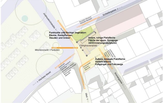 Der Bereich des seit 2008 nach der jüdischen Familie Ettinghausen benannten Stadtplatzes gehört zu den ältesten historisch und archäologisch relevanten Flächen der Höchster Altstadt. Am südlichen Rand des Platzes verlief seit dem Spätmittelalter bis ins 19. Jahrhundert die Stadtmauer mit dem sogenannten Hinterturm und davorliegendem Stadtgraben. Nach Umbau- und Umnutzung des Hinterturms als »Judenschule« zu Beginn des 19. Jahrhunderts entstand 1816 an Stelle des Hinterturms zunächst eine kleinere Synagoge. 1905 errichtete die inzwischen deutlich gewachsene jüdische Gemeinde an gleicher Stelle ein neues, größeres Gotteshaus als repräsentativen Klinkerbau. Während der Novemberpogrome 1938 wurde die Synagoge zunächst in Brand gesetzt und wenig später bis auf die Grundmauern abgetragen. Ab 1940 wurde unmittelbar östlich des Synagogen-Standortes ein Luftschutzbunker errichtet. Anstelle der Synagoge verblieb der Platz als ca. 400 qm großer, unbebauter Freiraum. Die Spuren dieser wechselhaften Geschichte wurden im Jahr 2020 im Rahmen von archäologischen Grabungen untersucht. Dabei wurden die verbliebenen Fundamente der Synagoge und des Hinterturms freigelegt und dokumentiert. Nach Abschluss der Grabungen wurde die Platzfläche mit einer einfachen Asphaltdecke vorläufig wiederhergestellt. Für die dauerhafte Gestaltung des Ettinghausenplatzes soll im geplanten Wettbewerb ein Konzept gefunden werden, das mit einer besonderen und hochwertigen Gestaltung die Geschichte des Ortes in angemessener Weise erlebbar macht.