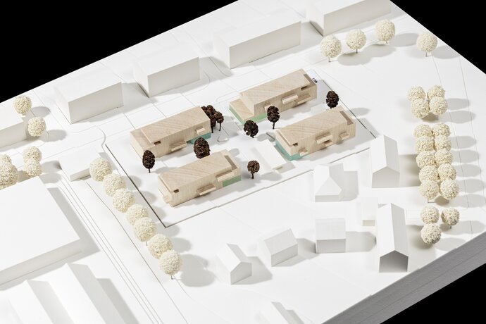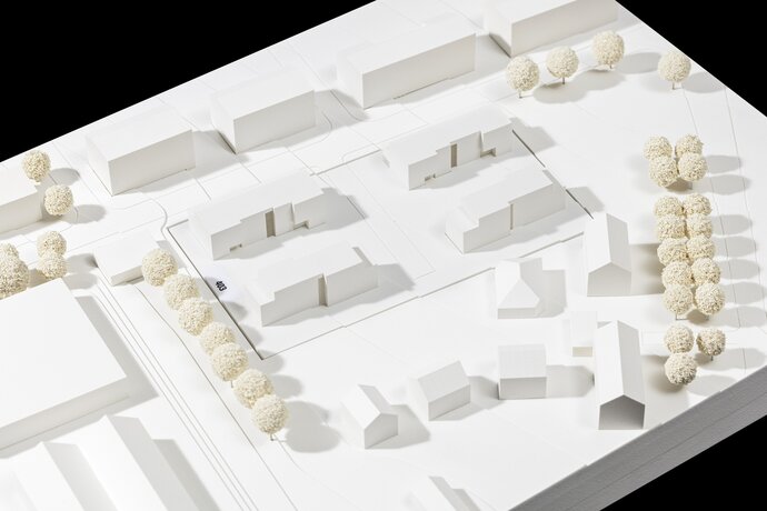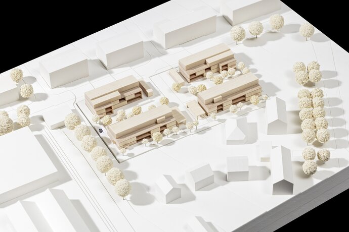 Die Arbeit überzeugt durch die Anordnung von vier klaren Baukörpern in den durch den B-Plan vorgegebenen Baufeldern. Die zur Niederfeldstraße orientierten Baukörper schaffen durch die auf der Straßenseite angeordnete Gebäudeerschließung eine Adressbildung. Die Gebäudeerschließung mit breiten und zugleich kurzen Laubengängen ermöglicht eine vielfältig gestaltbare Gebäudestruktur und schafft darüber hinaus wertvollen Begegnungsraum für die Laubenganganrainer.