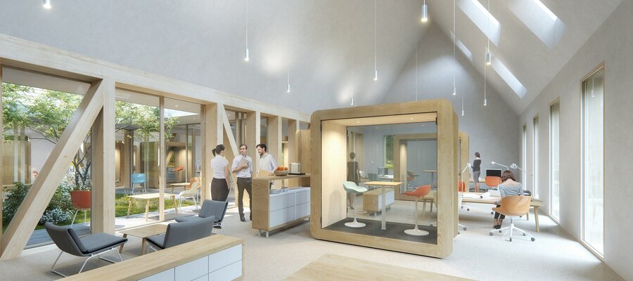 Es entstehen unterschiedliche Raumzonen, die gut mit entsprechenden Funktionen belegt sind. Die Zonierung und die Flexibilität in Kombination mit dem Innenhof schaffen eine hohe Qualität der Nutzung als Büro und Besprechung.