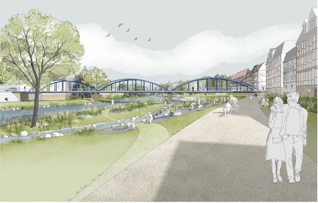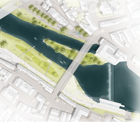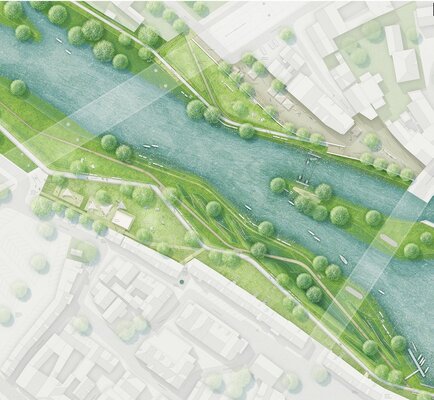 Die Verfasser*innen begreifen den Flussraum der Fulda als urbanen Raum im Norden und setzten der geometrisch geprägten Kante ein fließendes Südufer entgegen, das die Aue als dynamische Flusslandschaft ausbildet. Das Neustädter Ufer wird die urbane Stadtkante zum Fluss. Großzügige Sitzstufen, die in einem Podest am Wasser enden, laden zum Aufenthalt ein und bilden gleichzeitig den Übergang zum Wasser. Grüne Inseln mit Bäumen sollen den Bereich Am Kies gliedern und Aufenthaltsqualitäten bieten.