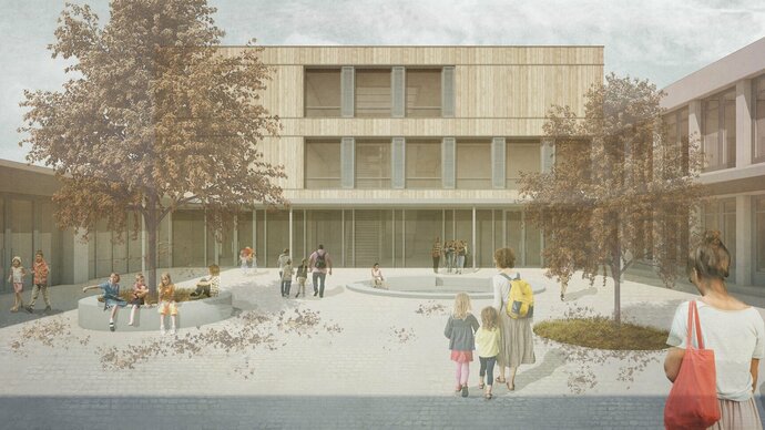 Der Entwurf besticht durch seine klare Struktur. Durch das Zurückspringen des neuen Baukörpers wird die Eingangssituation zur Schule städtebaulich aufgewertet. Die Cluster sind großzügig ausgestaltet und werden im 2. Obergeschoss durch Lichtkuppeln natürlich belichtet.