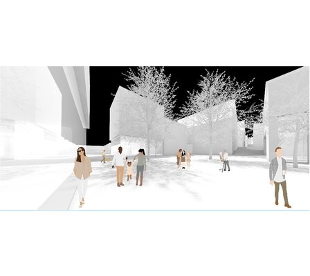 Das Quartier verzichtet auf einen dezidiert formulierten inneren Quartiersplatz und nutzt stattdessen die entstehenden Wegeverbindungen und das Motiv der „Gängelchen“ durch Aufweitungen und Verengungen zur Gestaltung spannungsreicher und attraktiver öffentlicher Räume.