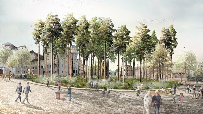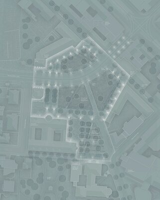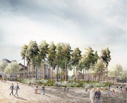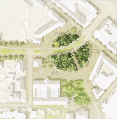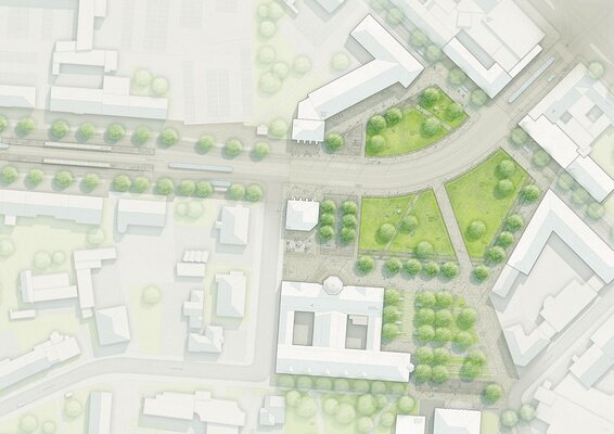 Der Entwurf verfolgt sehr konsequent und überzeugend die Fünfeckform der städtebaulichen Raumkanten der den Platz begrenzenden Gebäude. Unter Berücksichtigung aller wichtigen Wege- und Verkehrsverbindungen entsteht als zentraler Freiraum eine großzügige, fünfeckige und bespielbare Wiesenfläche, die sämtliche wichtigen Sichtbeziehungen respektiert und ermöglicht.