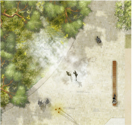 Der Beitrag überrascht mit der starken Idee, in die seit 1913 prägende Grundrissfigur des Brüder-Grimm-Platzes eine Kreisform einzuschreiben. In Erinnerung an die frühere Platzgestalt eines mit Bäumen umgebenen Rondells soll in diesem Kreis inmitten des Platzes ein ‚Märchenwald‘ mit Farnsträuchern und Moosen als dichten Bodenbewuchs sowie hochstämmigen Kiefern und Lärchen angelegt werden. Ein geometrisch klar begrenzter poetisch anmutender Erlebnisraum mit kleinteiligem Beleuchtungskonzept soll geschaffen werden, der Assoziationen an die Märchenwelt der Brüder Grimm wachrufen soll.