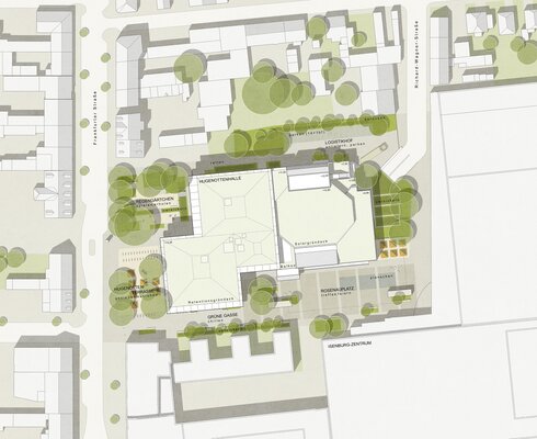 Ziel ist, die Hugenottenhalle gemeinsam mit der Stadtbibliothek und der zu integrierenden Volkshochschule im Rahmen einer baulichen Sanierung und Erweiterung, begleitet von diversen organisatorischen und funktionalen Maßnahmen, zu einem Kultur- und Bildungszentrum im Sinne eines Dritten Ortes zu entwickeln. Hierzu ist das zu modernisierende Bestandsgebäude im Zusammenwirken mit seiner Erweiterung funktional und architektonisch anspruchsvoll sowie nachhaltig weiterzuentwickeln und ansprechend in das ebenfalls aufzuwertende städtebauliche Umfeld zu integrieren.