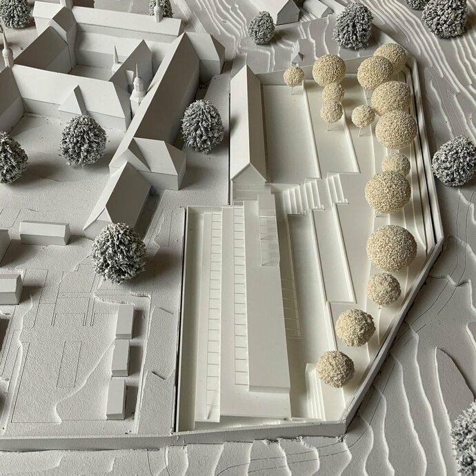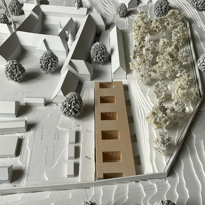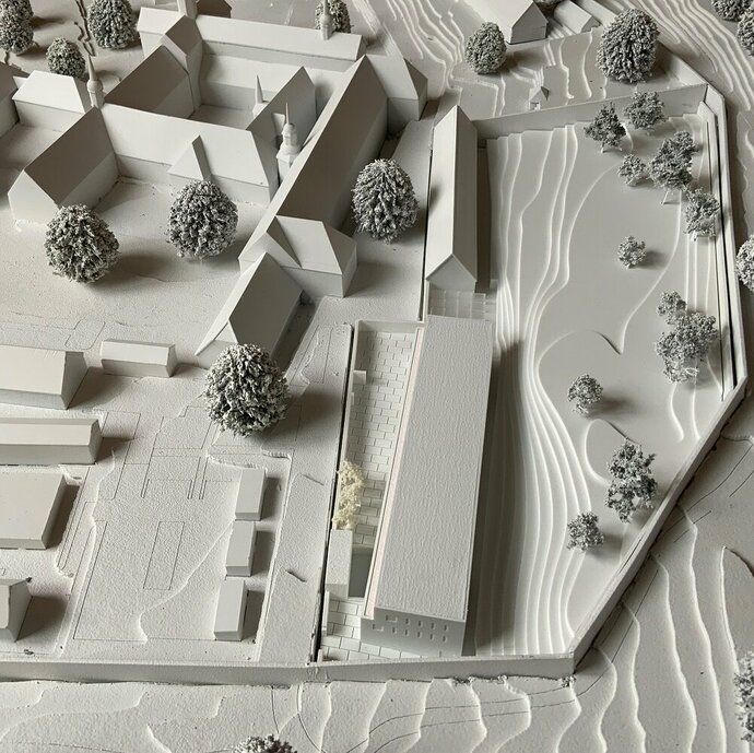 Die Hotelerschließung überzeugt mit Ihrer klaren Struktur und bietet Aufenthaltsqualität mit Blickbeziehungen in die inneren Höfe, die umgebende Landschaft und die Klosteranlage. Die bestehende Mauer, welche das Bestandshotel verlängert und L-förmig bis zum Nordtor die innere Klosteranlage fasst, nutzen die Verfasser um Ihr neues Hotelensemble zurückhaltend und selbstverständlich hinter der Mauer in die Gesamtanlage einzufügen.