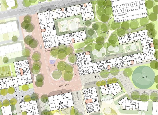Eine Qualität des Entwurfs wird in der Lage und Dimension des zentralen Platzes gesehen. In der Querspange und Anbindung an das TU Gelände und mit der KITA als Abschluss, die ihren Spielbereich nach Süden ausrichtet, bietet dieser Platz das Potenzial die verschiedenen Quartiersbausteine zusammenzufügen.
