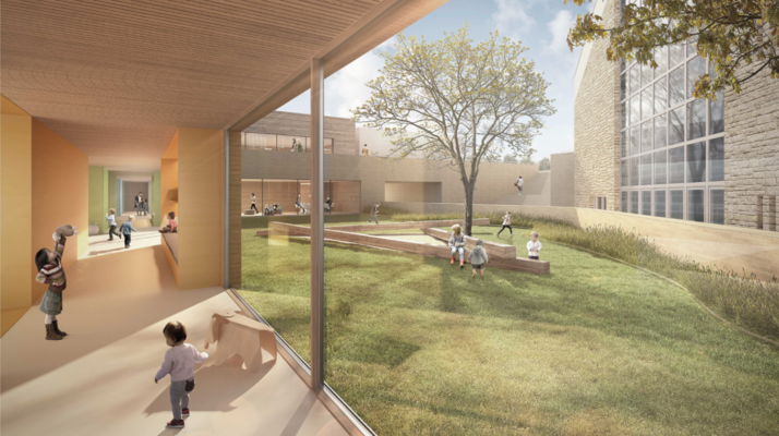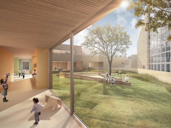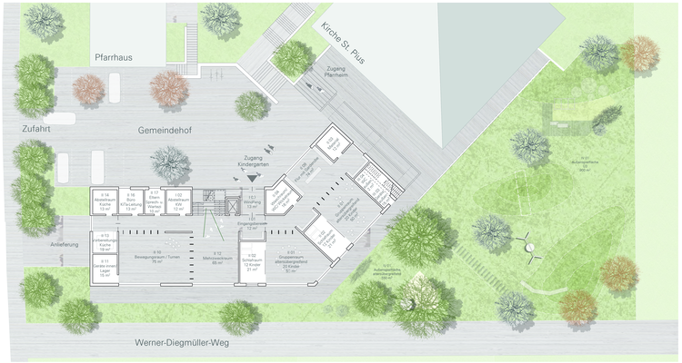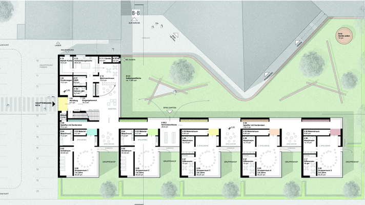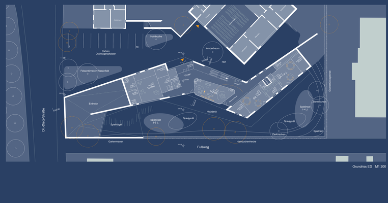 Die zusammenhängende Außenspielfläche, mit ihrer sinnvollen Orientierung Richtung Süden, ist in einer stimmigen Tiefe ausgebildet und bildet durch die Höhenentwicklung ein spannendes Angebot. Im Erdgeschoss wird die Flexibilität des zentralen Eingangsbereiches mit seiner Variabilität durch die variabel zusammenschaltbaren / abtrennbaren Raumeinheiten und seinem Außenraumbezug als überaus wertvoll geschätzt.