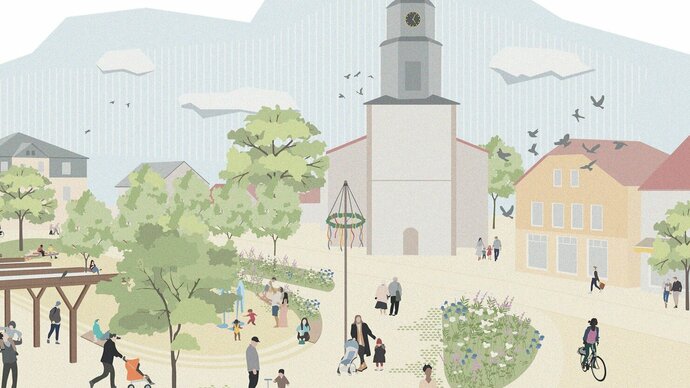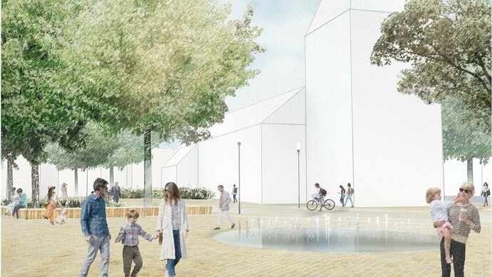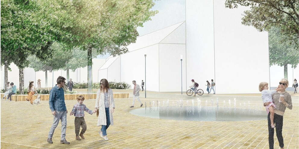 Das Zentrum der neuen Stadtmitte bildet ein multifunktionaler Freiraum. Die Struktur und die räumliche Gliederung des Platzes überzeugen durch ein offenes, ebenerdiges Konzept, welches wichtige Blickbezüge und eine klare Verbindung zur Kirche herstellt und die umgebenden Nutzungen in den neuen Stadtnukleus einbezieht.