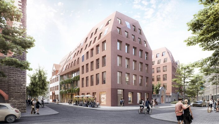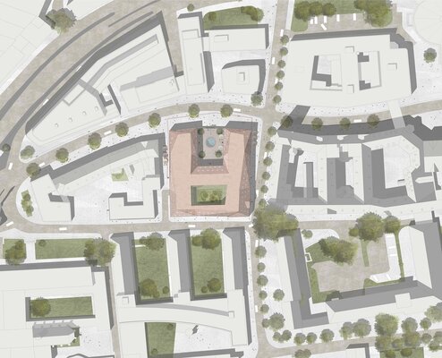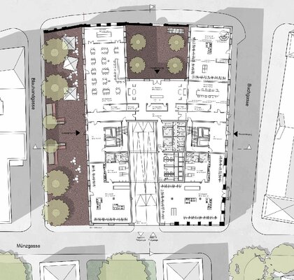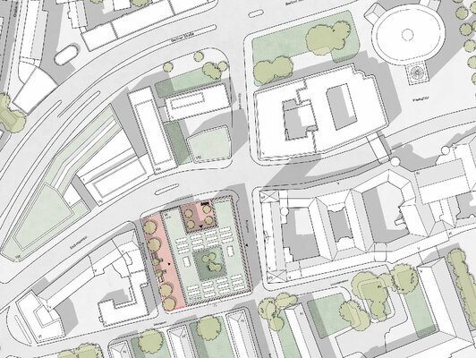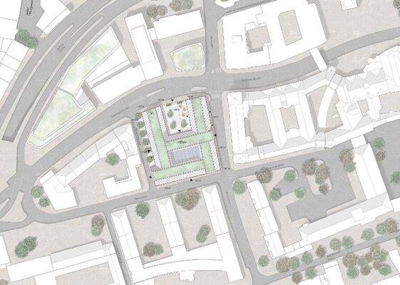 Städtebaulich sieht der Entwurf sich in der Kontinuität der Gebäudetypologien dieses Ortes und begründet sich nicht nur auf den heutigen Bestand, sondern auch auf vorangegangene historische Entwicklungsstufen der Bebauung bezüglich der Blockränder und innenliegender Höfe und Gärten.