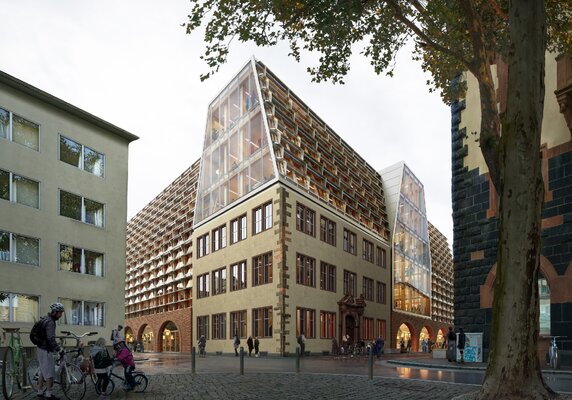 Modernes Bürogebäude mit historischer Nachbarschaft