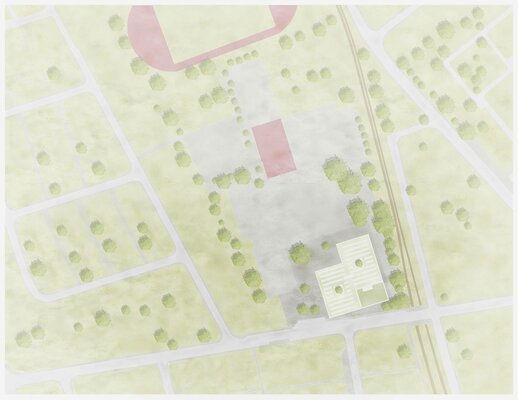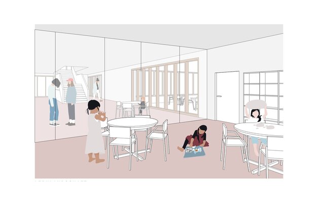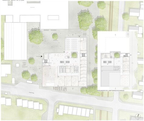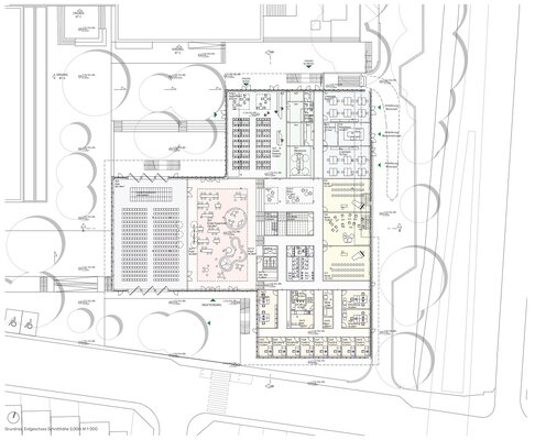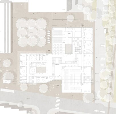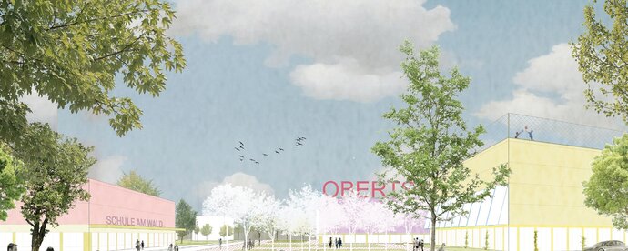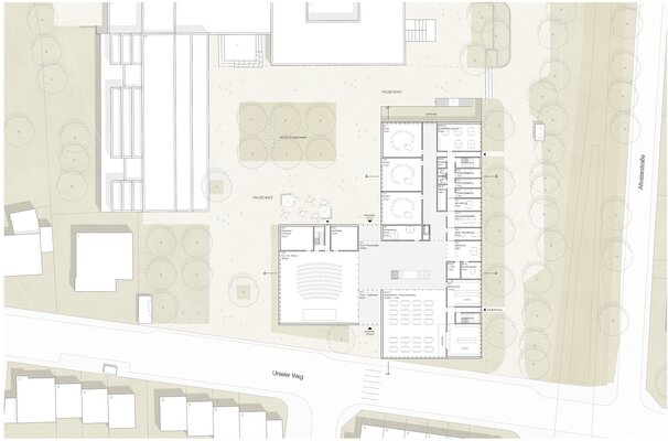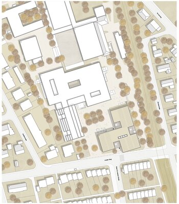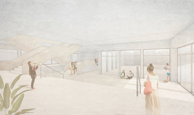 In den neu zu schaffenden, adressbildenden Eingangsbereich des Neubaus sollen Mensa und Aula multifunktional und architektonisch ansprechend integriert werden. Die Aula soll dabei als quartiersbezogene Versammlungsstätte genutzt werden. Der Eingangsbereich soll mit einer „einladenden Geste“ die Schule nach außen hin visuell öffnen, und dabei gleichzeitig den Campus zur Straße hin abschließen.