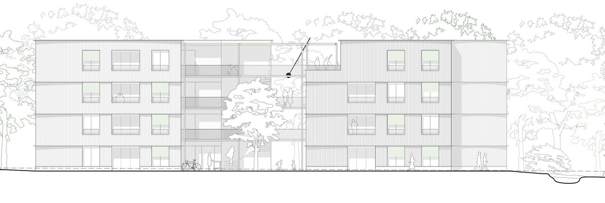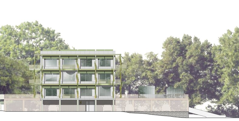 Die Arbeit weist die geringsten Treibhausgasemissionen aller Arbeiten sowohl in der Herstellung als auch über den gesamten Lebenszyklus auf. Grund dafür ist die geringe Bruttogrundfläche, die Ausführung mit einer großen Menge nachwachsender Rohstoffe sowie der weitgehende Verzicht auf Untergeschosse und ein eigenes Parkhaus.