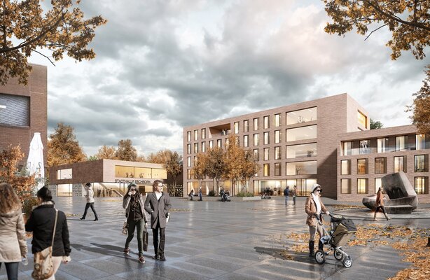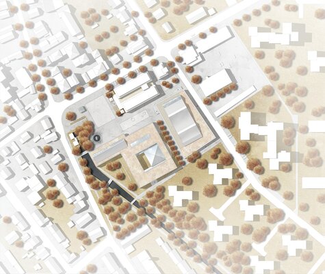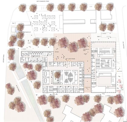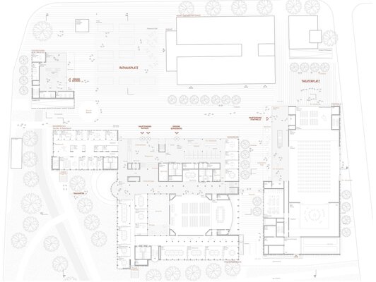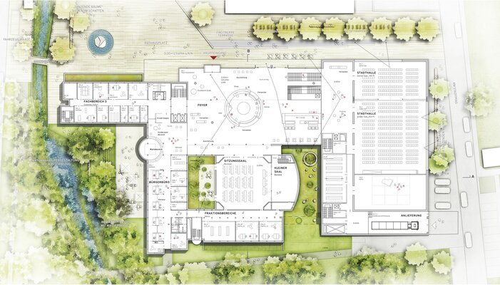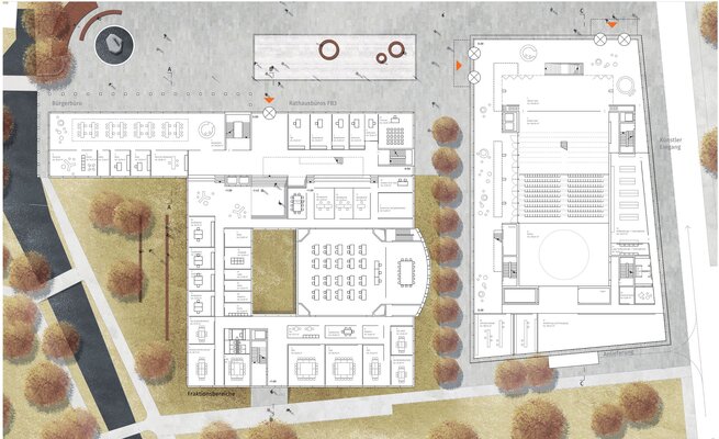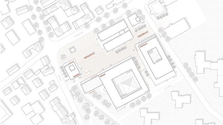 Die Baukörper formen einen klar definierten und wohl proportionierten Stadtraum, der zwei Zonen aufweist mit dem Rathausplatz im Norden und dem Vorplatz zur Stadthalle im Süden. Die Platzbegrenzung im Westen erfolgt durch die Bibliothek, die als eigenständiges Gebäude am Westrand über dem Westerbach positioniert ist. Die Leseterrasse im 2. OG wird als Element an dem prominenten Standort besonders gewürdigt.