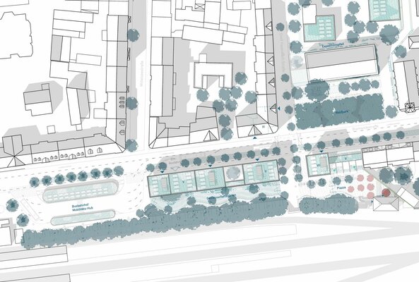 Die Stadt Offenbach am Main verfolgt im Senefelderquartier und der südlichen Innenstadt ein integriertes Entwicklungskonzept zur Verbesserung der Lebensqualität der Bürgerinnen und Bürger. Der Ideenwettbewerb umfasst die Gesamtsituation mit dem östlichen Teil des Busbahnhofes und dem dort möglichen Baufeld, den Straßenraum sowie die Freiflächen nördlich der Bismarckstraße.