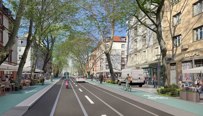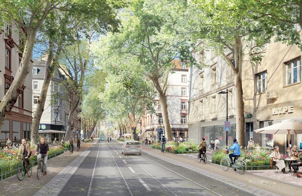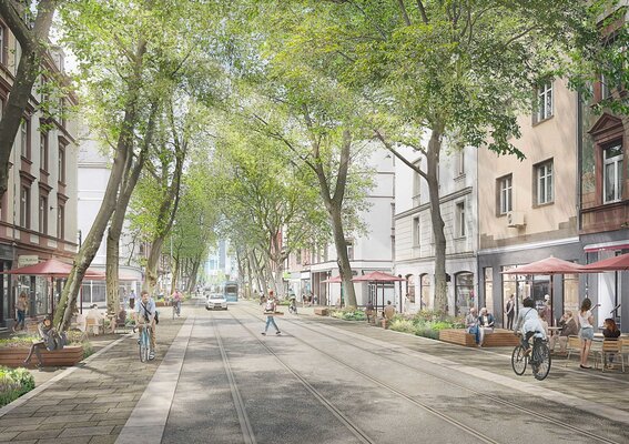 Um einerseits dem Beschluss zur „Fahrradstadt“ gerecht zu werden und andererseits die unterschiedlichen Nutzungsanforderungen weiterhin zu berücksichtigen, ist Kreativität angesagt, der Handlungsspielraum gleichwohl jedoch begrenzt. Grenzen setzen hierbei der Querschnitt, erhaltenswerte Baumreihen, verschiedene Gastronomieflächen, die Straßenbahngleise und nicht zuletzt der Fuß-, Rad-, Liefer- und Kfz-Verkehr. Somit gilt es unter Beachtung der vorlaufend erarbeiteten Machbarkeitsstudie sowie der Ergebnisse der Öffentlichkeitsbeteiligung Lösungen zu finden, die im Rahmen des Möglichen sind und die Anregungen aus dem Beteiligungsprozess aufnehmen. Dies soll zu einer gestalterischen und funktionalen Aufwertung des Straßenraums entsprechend der eingangs genannten Zielsetzung führen.