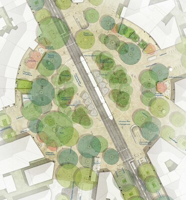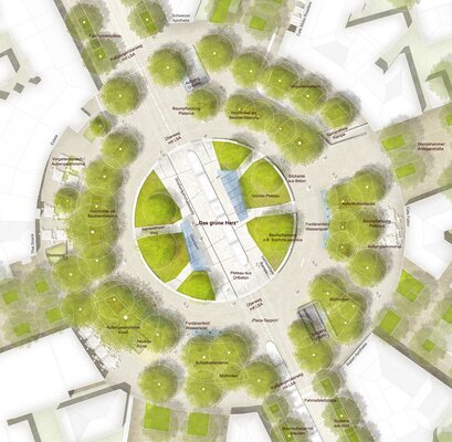 Die kreisförmige Geometrie des Schweizer Platzes wird aufgenommen und nach dem Zwiebelprinzip in unterschiedliche ringförmige Zonen unterschiedlicher Atmosphären und Funktionen gegliedert