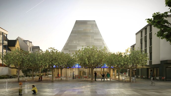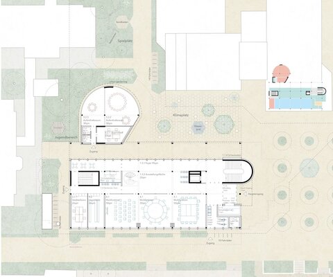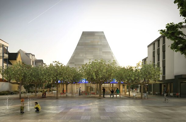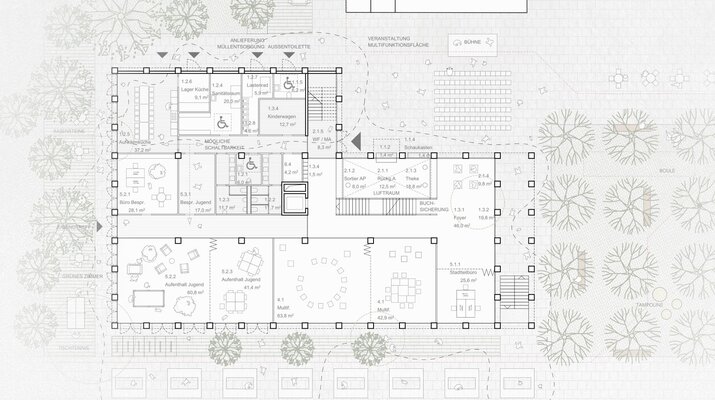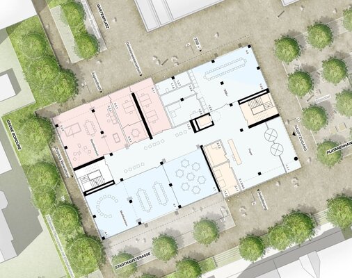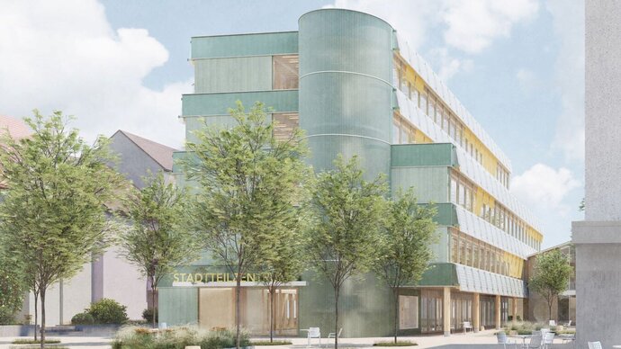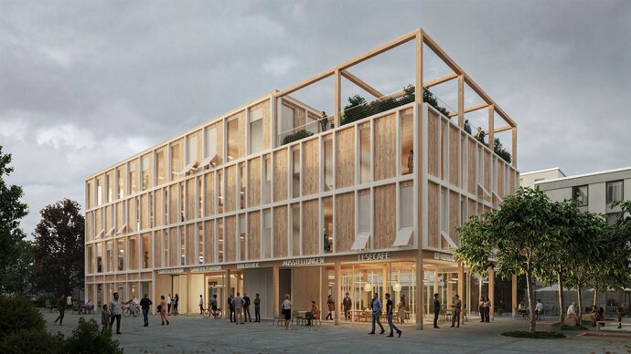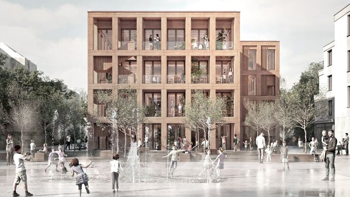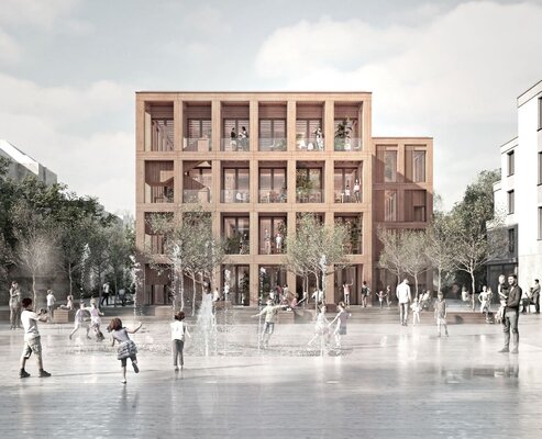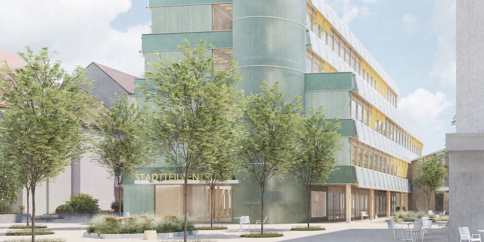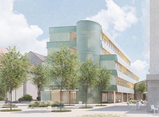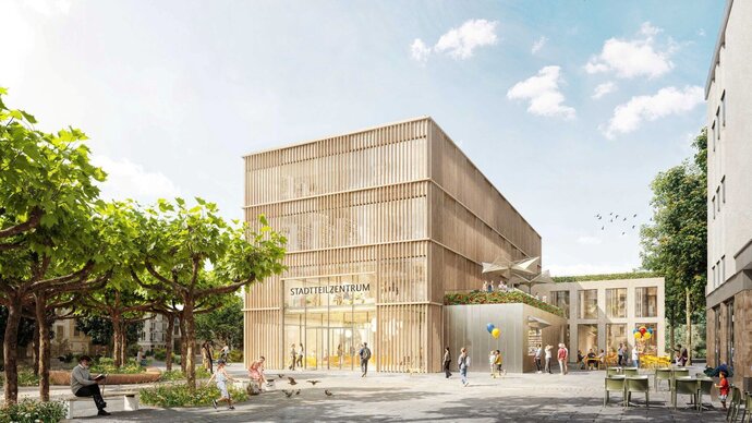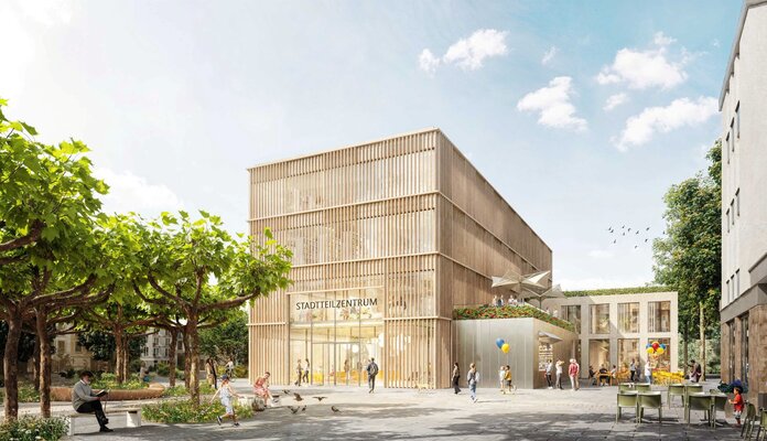 Das neue Stadtteilzentrum zeigt eine klare und adressbildende Setzung zum Puiseauxplatz, an dem es eine starke Präsenz entfaltet. In Bezug auf Wirtschaftlichkeit und Nachhaltigkeit wird auf eine kompakte, robuste Bauweise und ressourcenschonende Materialwahl (Holz, Lehm) geachtet, die Umbaupotentiale und einen sortenreinen Rückbau mitdenken.