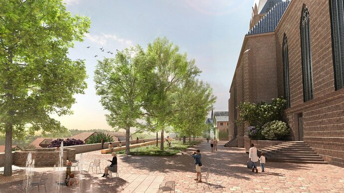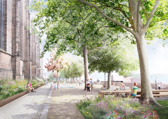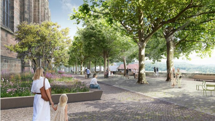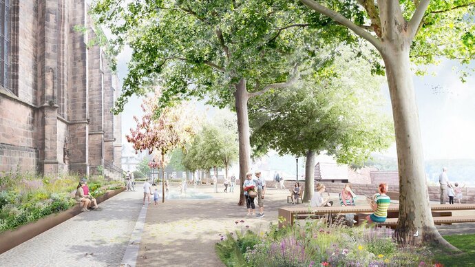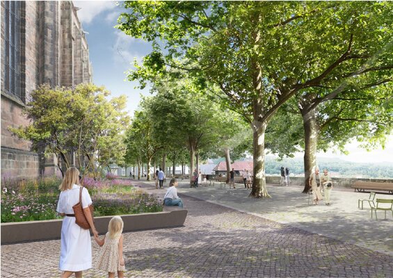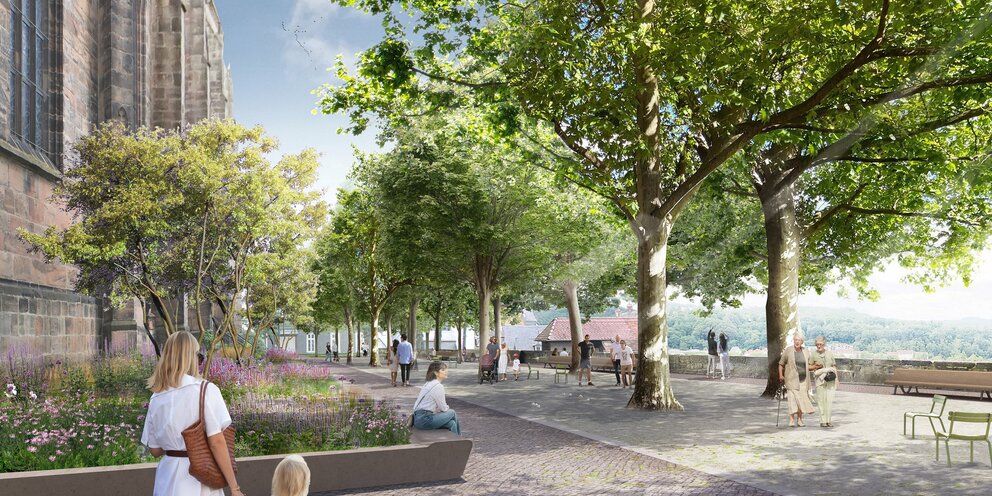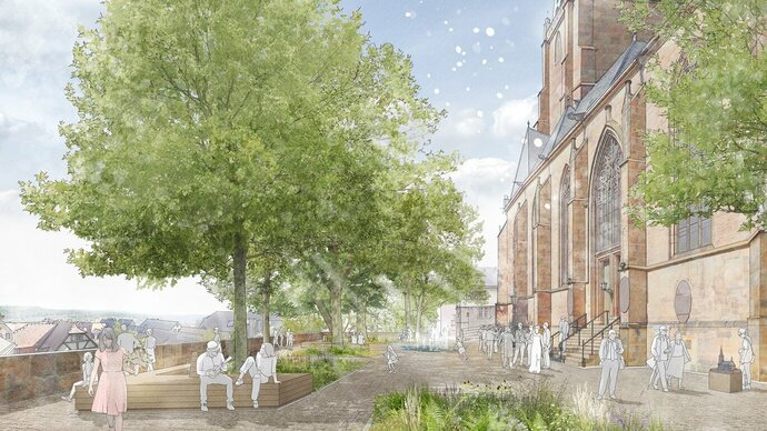 Der Kirchhof selbst wird von einer großzügigen Baumhalle geprägt, die den Stadtbalkon prägnant inszeniert. So entsteht ein schattiger, atmosphärischer Raum, der mit dem Bauwerk der Kirche gut korrespondiert.