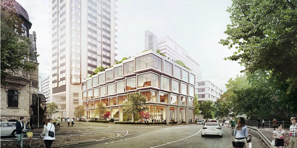 Als „liegendes Bauwerk“ verbindet sich das neue Gebäude, das sich bewusst von der Körnung und Struktur der historischen Stadtkante absetzt, über den Hochhaussockel zu einem L-förmigen Gebäudeensemble mit dem Hochhaus.