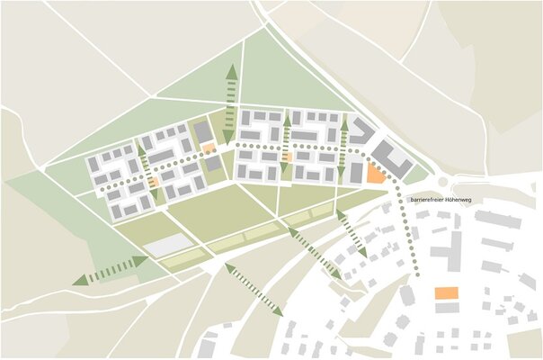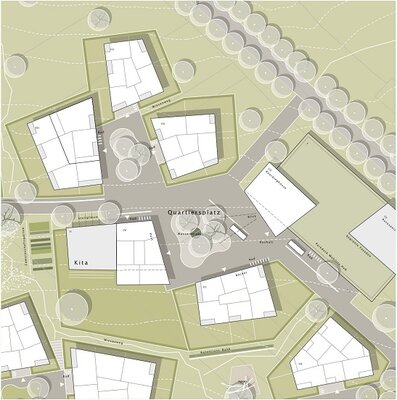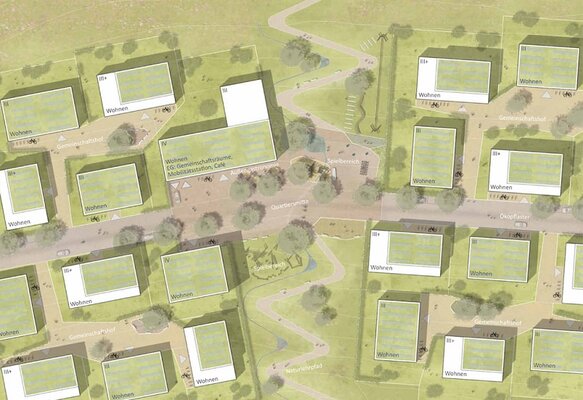 Der Entwurf weist als Alleinstellungsmerkmal eine Quartiersorganisiation in Form von Gehöften auf, die sich jeweils um einen Doppel- oder Zwillingsraum gruppieren. Dadurch entsteht eine markante städtebauliche Struktur mit ziselierten Gebäudekanten und Ecken, die eine besondere Raumsprache mit abwechslungsreichen Freiräumen erzeugen. Der Bewohnerschaft werden außergewöhnliche Wohnqualitäten und Blicke in die umgebenden Freiräume geboten.