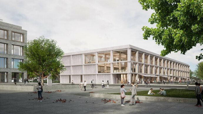 Die neue Mensa wird auf der Grundlage des für den Campus formulierten Masterplanes zentral am neuen Campusplatz sowie an einem die beiden Campusbereiche verbindenden Parkband („Wiese mit Bäumen“) gelegen sein und in unmittelbarer Nachbarschaft zu weiteren hochfrequentierten Hochschulnutzungen, wie dem in Planung befindlichen Seminargebäude 1 und dem bereits im Bau befindlichen Neubau der Zentralbibliothek liegen. Mit dem Campusplatz, dem zentralen Parkband und den drei arrondierenden Gebäuden erfolgt die Integration der bisher getrennten Campusbereiche Philosophikum I und II zu einem zusammengehörigen und integrierten Campusareal.