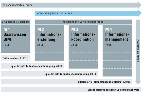 Das Qualifizierungsprogramm BIM besteht aus einem zweitägigen Basismodul und drei vier- bzw. fünftägigen Vertiefungsmodulen. Die vier Module sind aufeinander aufbauend und werden in chronologischer Reihenfolge absolviert. Im letzten Modul schließt die Qualifizierung mit einem Leistungsnachweis zum Erwerb der Abschlussurkunde ab. Der Gesamtumfang beträgt inkl. des Abschlusstages 16 Tage (128 UE)